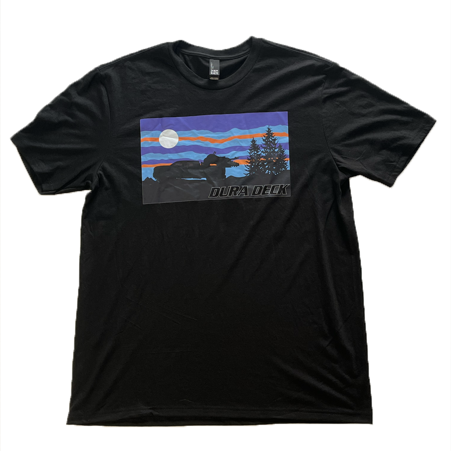 The Sunset Deck T-Shirt is a short sleeve t-shirt with natural stretch and a highly breathable interior that’s casual and comfortable. There is also a custom Dura Deck on a truck in front of a sunset on the chest graphic placement. Â